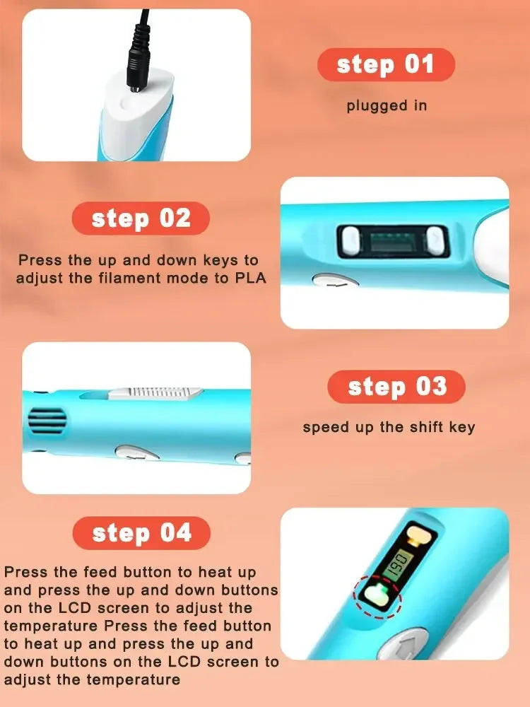 - Start Creating: Hold the pen, press the button, and let the filament flow to bring your ideas to life.