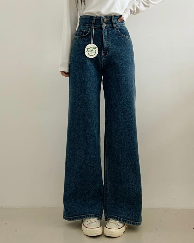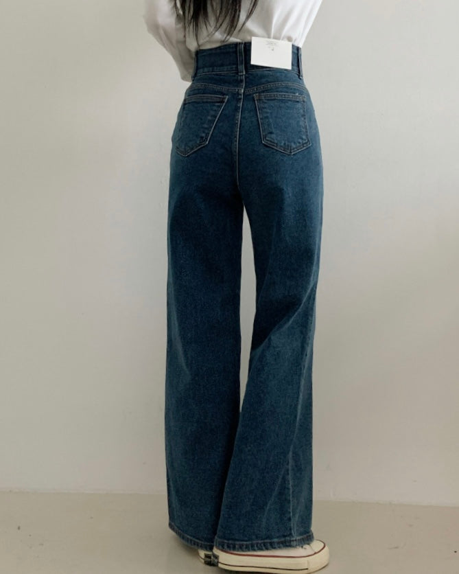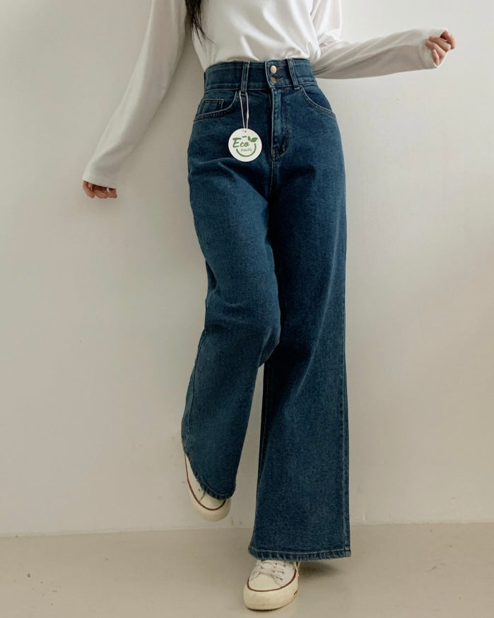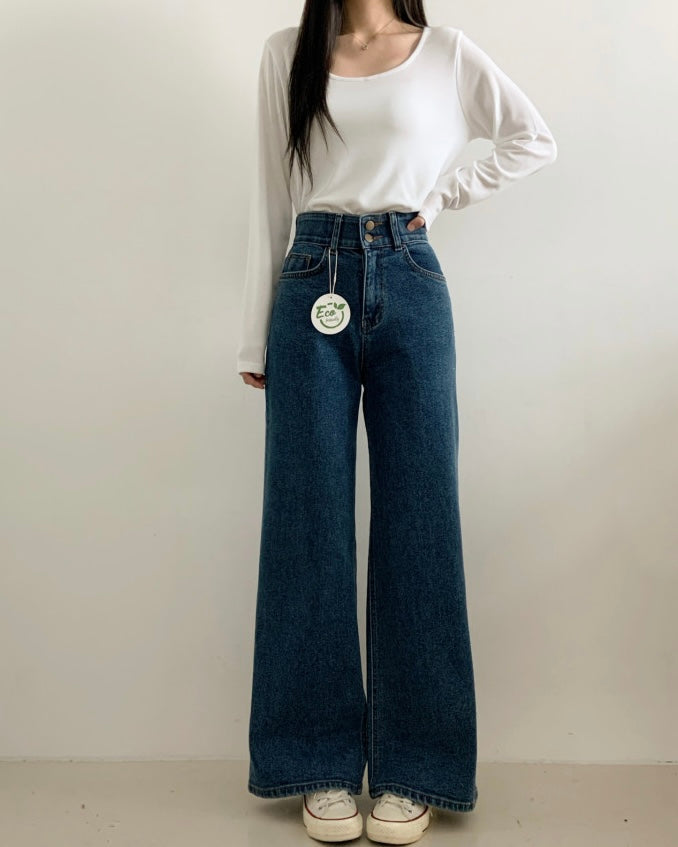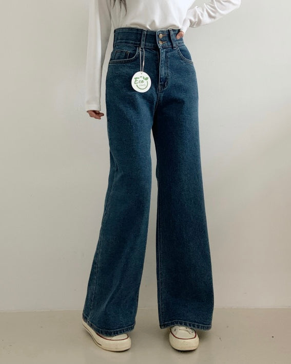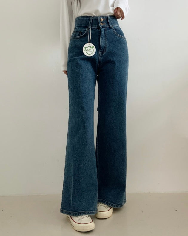 Designed with a clean wide-leg flare, these jeans create a sleek and elongated silhouette. The double-button waistband provides extra hold and shape. Soft stretch denim hugs your waist comfortably without feeling tight. Perfect for daily wear with just the right balance of structure and ease.