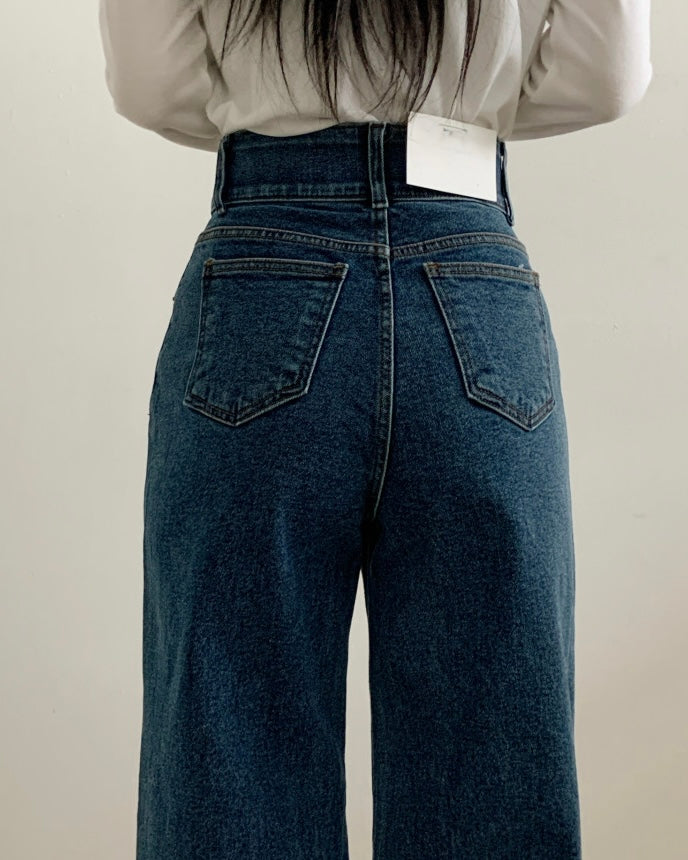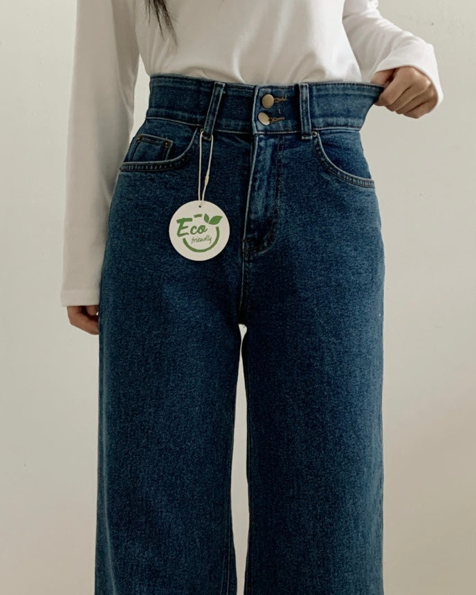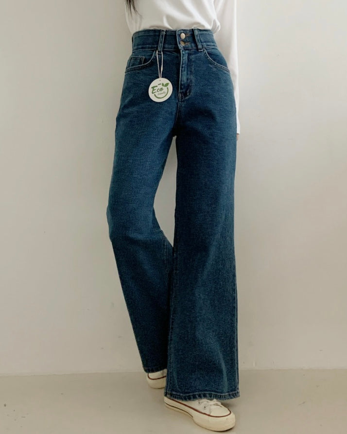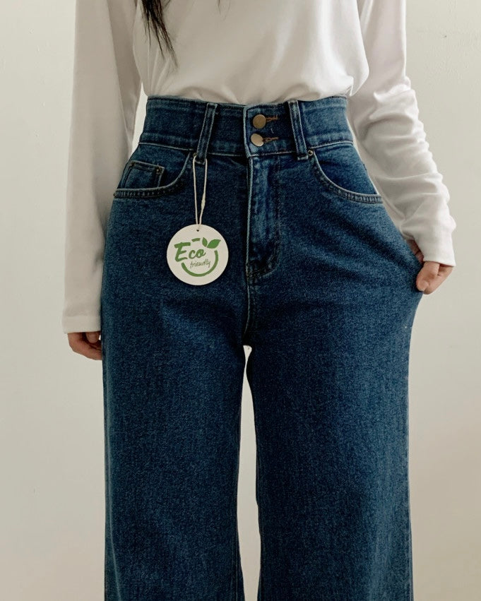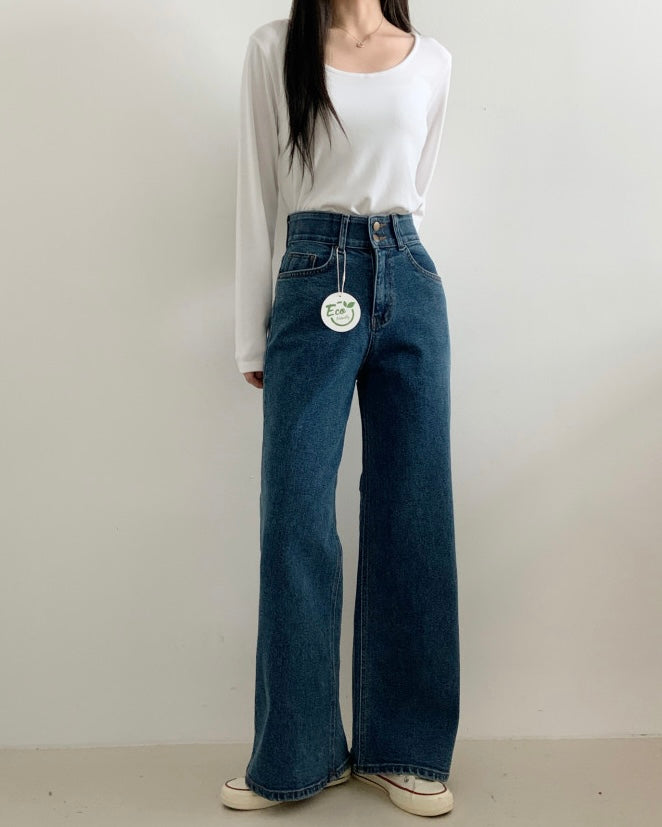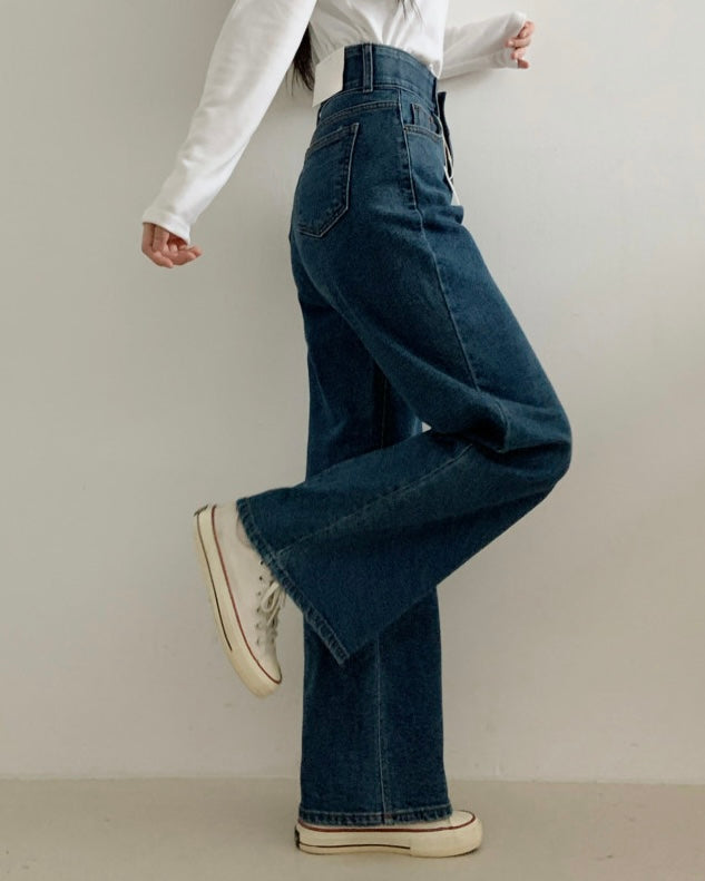 Designed with a clean wide-leg flare, these jeans create a sleek and elongated silhouette. The double-button waistband provides extra hold and shape. Soft stretch denim hugs your waist comfortably without feeling tight. Perfect for daily wear with just the right balance of structure and ease.